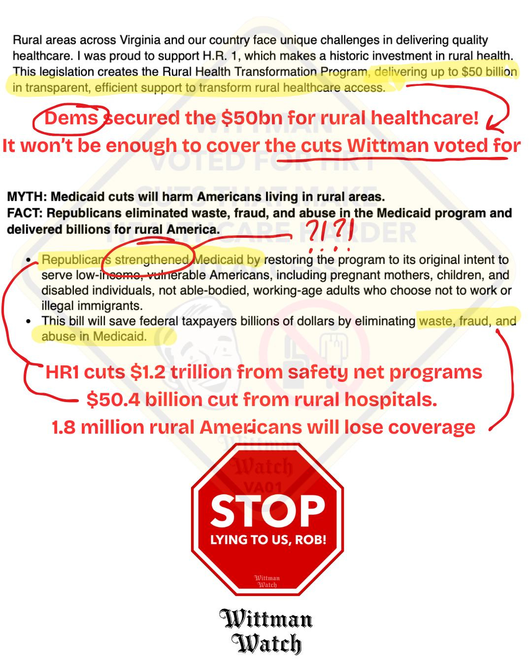 As we've documented multiple times, HR1 cuts $1.2 trillion from safety net programs, with $50.4 billion specifically from rural hospitals. 1.8 million rural Americans will lose coverage. But Wittman's wealthy donors are getting tax breaks, so let that comfort us as we die from the flu.