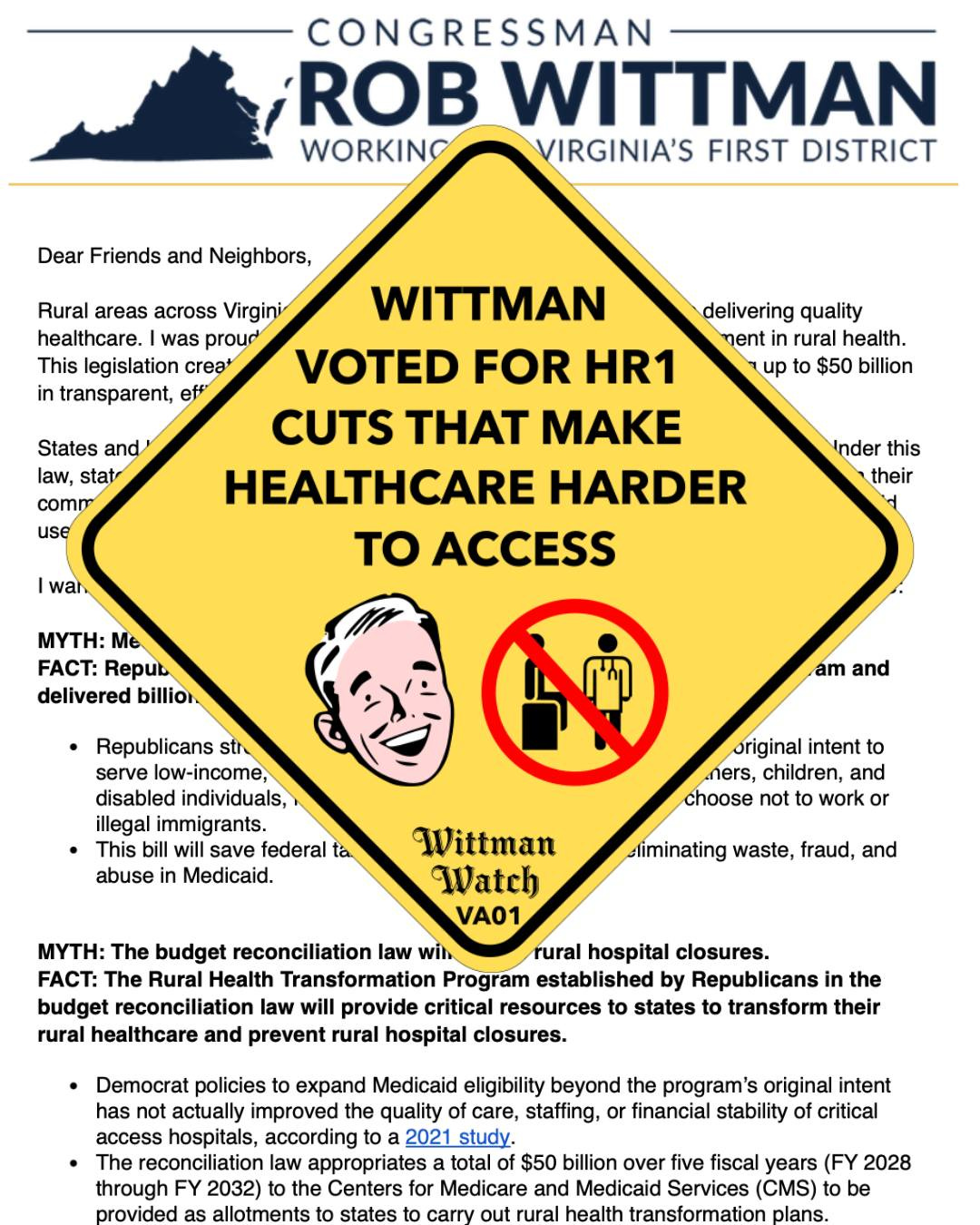 Rob Wittman and Republicans’ desperation is on full display with his latest volley of disinformation about HR1 and Medicaid. This "mythbusting" is blatant, deliberate nonsense dressed up in Rob's "moderate everyman" clothing. This is simply disgraceful. Here's why.