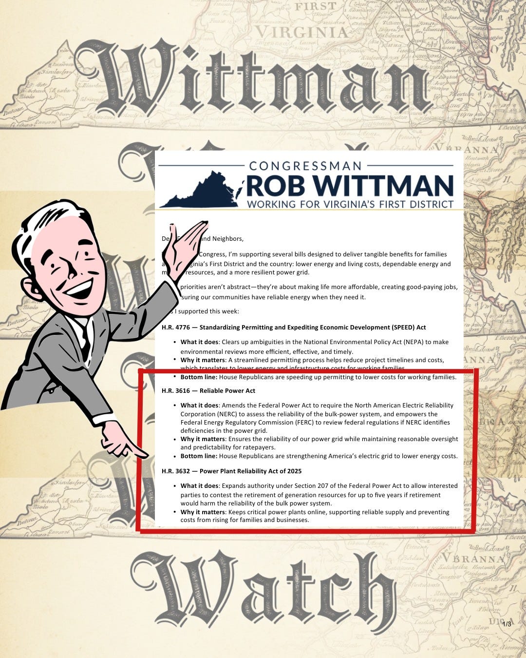 Now for the latest installment of Wittman's End-of-Week claims. He boasts that backing H.R. 3616 and H.R. 3632 will "strengthen America's electric grid and lower energy costs” - let's zoom in, shall we?