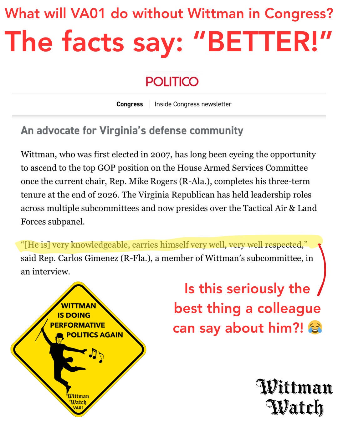 Wittman hasn’t successfully advocated for VA01 jobs, companies, or the economy. He’s just kinda there. We in VA01 deserve better. And Politico should quit the pearl-clutching about Wittman’s likely ejection from our seat.