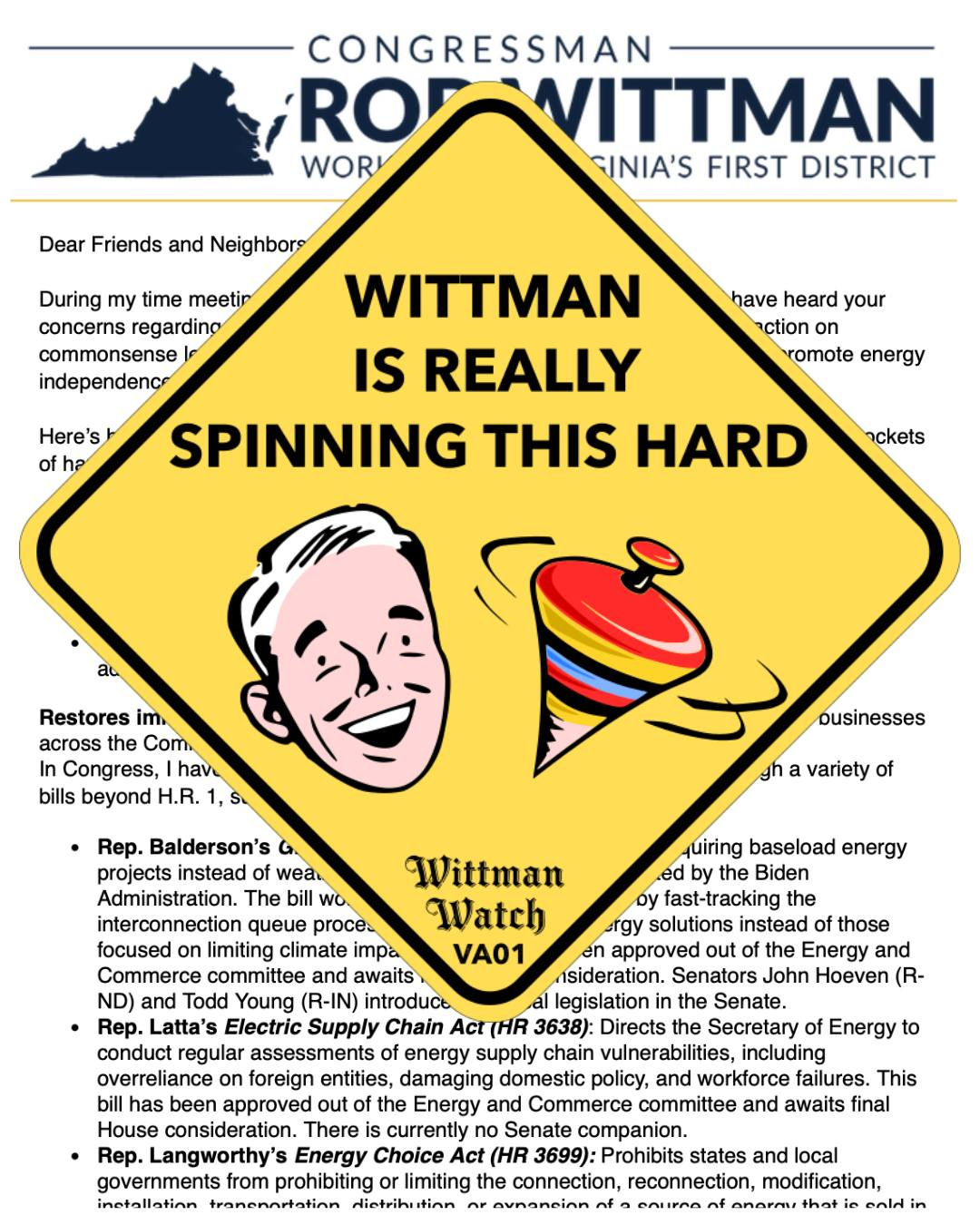 On the "tell": we think Rob's emails were written a while ago by Republican Propaganda Central. For example, he says HR3699 (Energy Choice Act) "awaits Committee consideration" but it passed committee a week ago! Clearly these messages are queued up in advance but being a WEEK out of date is negligence of the highest order. A bit like Wittman being out of date as a Congressperson, we guess!