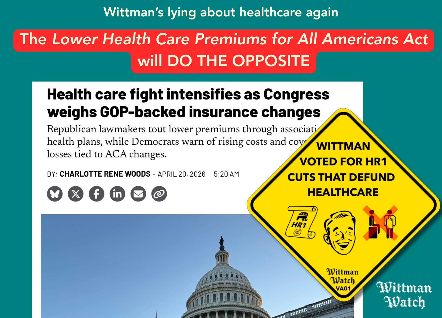 More seriously, Wittman is again failing to address the ACA tax credit expiration already costing thousands of Virginians their coverage - a crisis that H.R. 6703 sidesteps entirely. Of course, this is Wittman’s intention: to appear to be doing something while actually doing nothing. He is ignoring our needs, feeding us this empty, dangerous nonsense while he and his Republican colleagues in Congress continue to enrich themselves while failing to serve their districts.