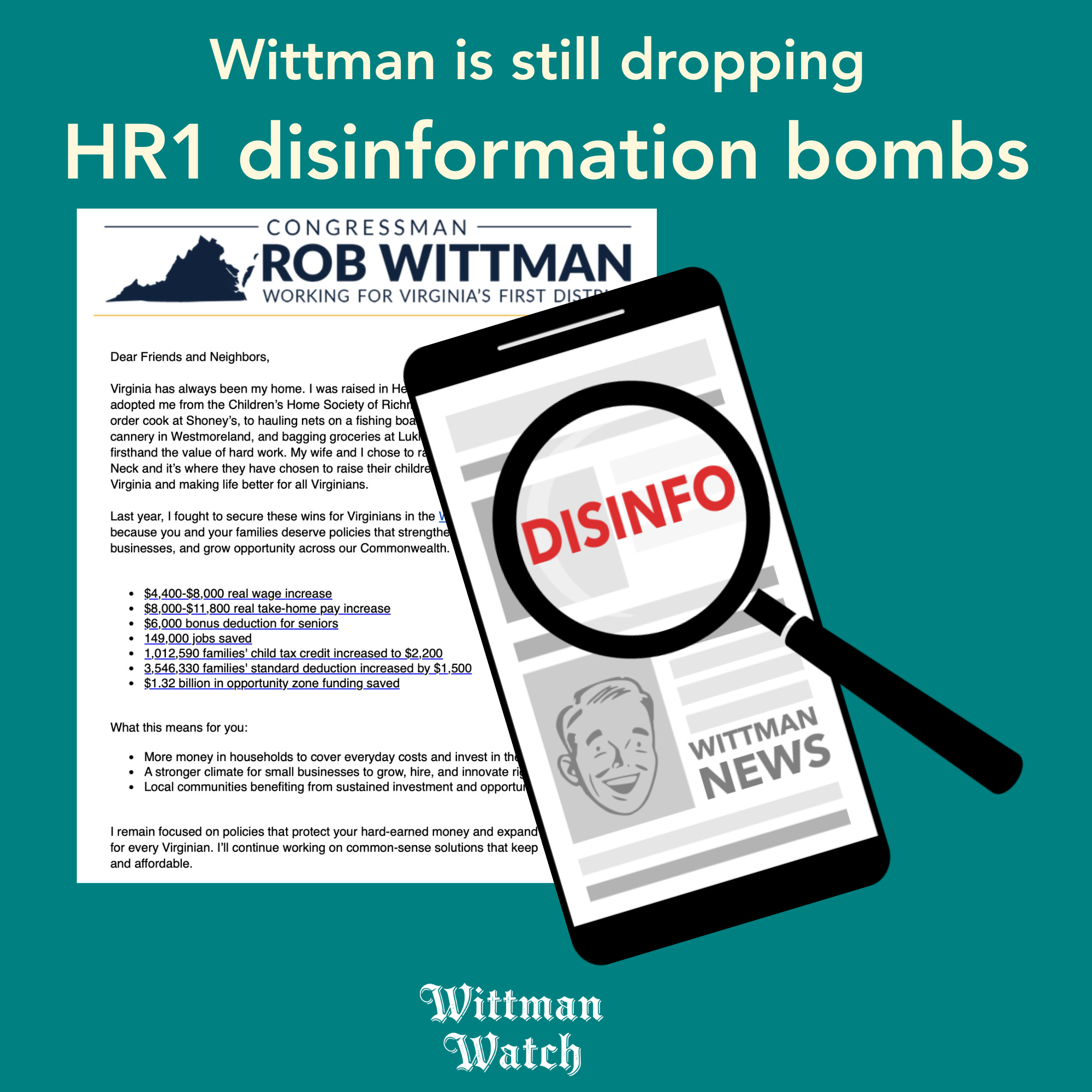 Another H.R. 1 disinformation bomb from Wittman yesterday. Tiresome! We’ve dealt with H.R. 1 again and again and again. The Republican Propaganda Machine is spinning at max speed to deceive VA-01 voters about the bill’s horrors. So we’ll review this again, louder for those in the back.
