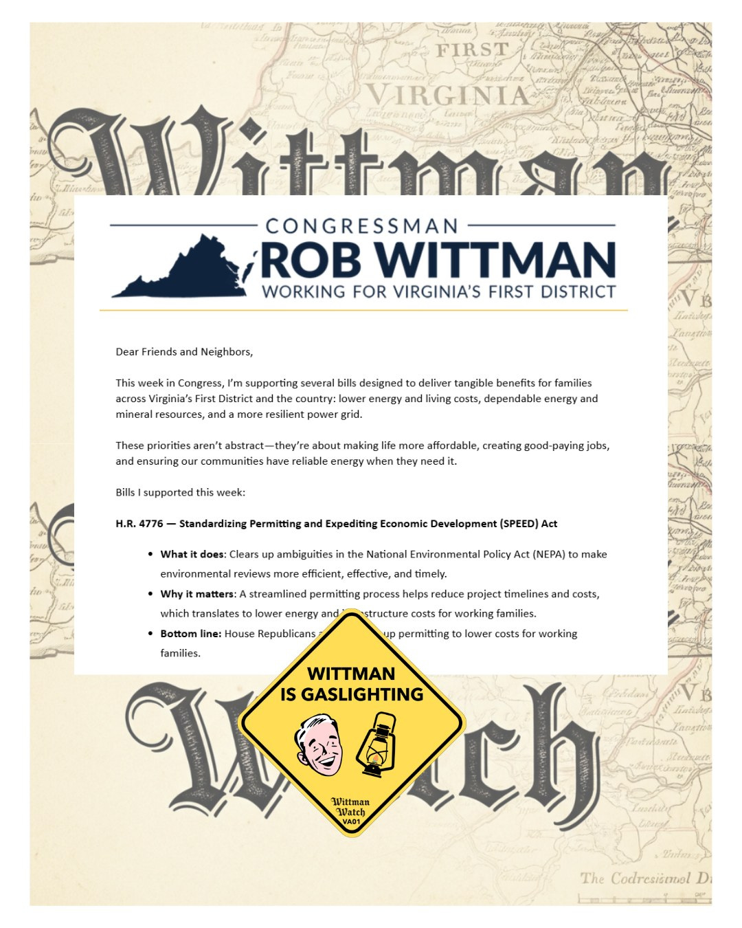 First up: Wittman claims that he supports H.R. 4776, the SPEED Act, as it "clears up ambiguities in the National Environmental Policy Act (NEPA) to make environmental reviews more efficient…which translates to lower energy and infrastructure costs for working families."