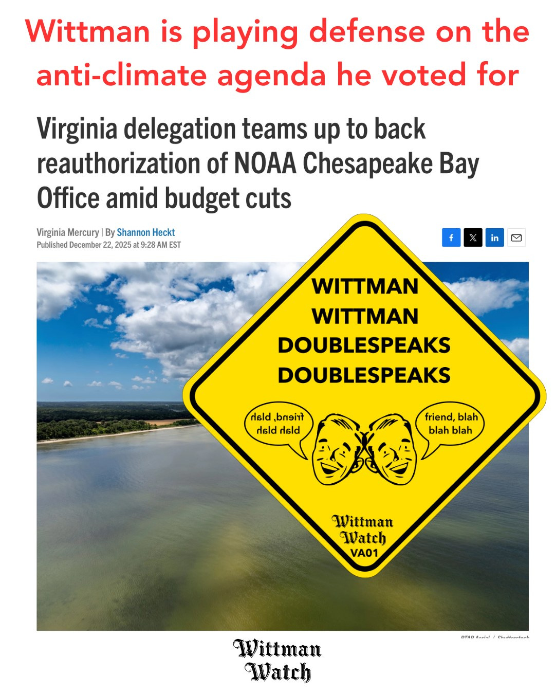 The Virginia and Maryland Congressional delegations, including Rob Wittman, have written a bill to reauthorize the NOAA Chesapeake Bay Office (CBO). This is good - but it’s only needed because of the MAGA anti-climate agenda Wittman keeps supporting.
