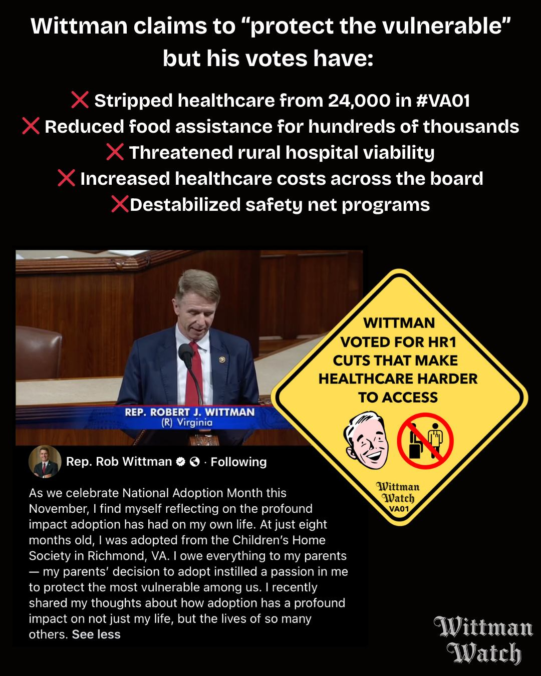 Rob Wittman claims he's inspired to "protect the vulnerable" because of his own history as an adoptee. But his votes have: